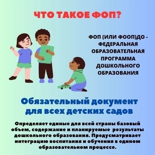 Уважаемые родители, информируем Вас о том, что с 01.09.2023 г. все детские сады переходят на работу по новой Федеральной образовательной программе дошкольного образования (далее ФОП ДО).